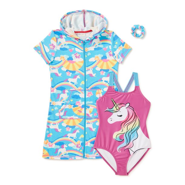 Saint Eve Girls Unicorn Printed One Piece Swimsuit With Hooded Cover Up And Hair Scrunchie 4 12 Walmart Com